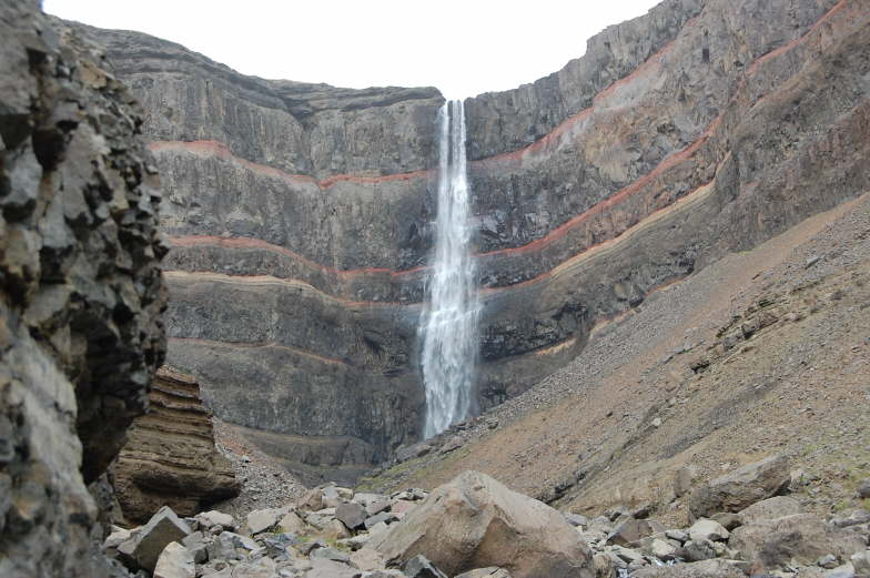 der Hengifoss, mit 126 m der dritthöchste Wasserfall, die roten Zwischenlagen sind Vegetationsschichten zwischen Lavaschichten