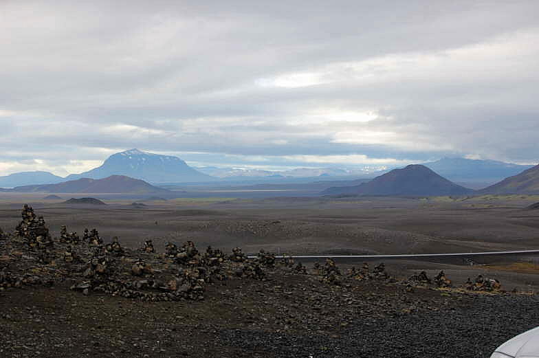 ein Rastplatz mit einem Feld gebauter Trolle (vermutlich von Touristen), hinten links der “Herdubreit”