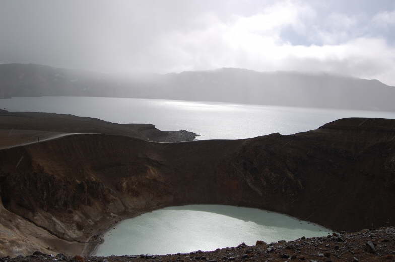 dessen Wasser heiss ist und zum Baden einlädt, im Hintergund der Krater Askja, voll Wasser gelaufen