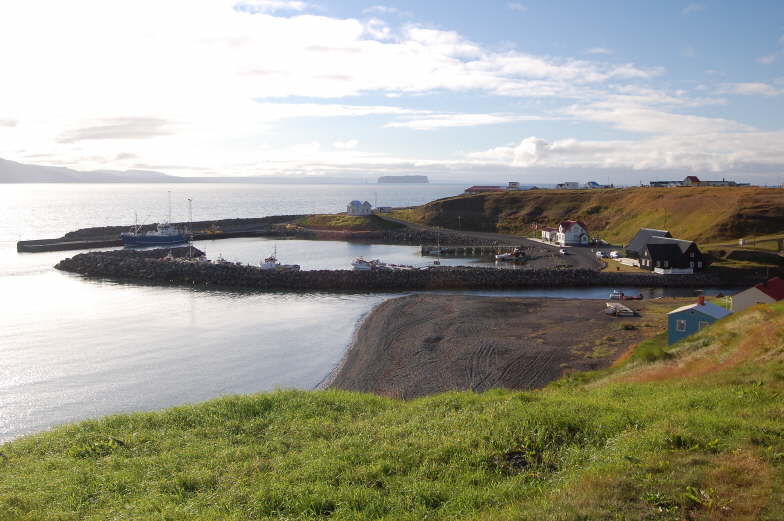 der kleine Hafen von Hofsos, im Hintergrund die Insel Drangey